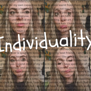 Individuals make different choices to distinguish their identity, such as hair colour, food preferences, shoe styles, dress sense, drink choice and so much more. Some individuals may also have distinguishing features. Individual difference are also strongly apparent within course choice / work choices that are chosen. It goes so FAR!! But the messages still stay the same, you are you, and you are who you are based on the choices you make, the nurture you received and the nature you perceive. There are a lot of circumstantial situation that can determine or have a detrimental effect on individuality such as temporary or long term mental / physical health conditions as these will in a sense create a new outlook for you to process amongst yourself. But with every new opportunity or mishap, we sponge it up into our processes and we begin to regulate them – love, loss and guilt all have the ability to change personality traits for the better or for the worse.