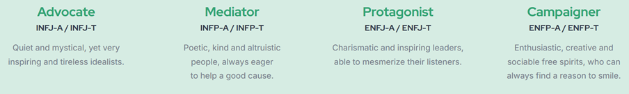 Intuitive (N) and Feeling (F) personality types, known for their empathy, diplomatic skills and passionate idealism.