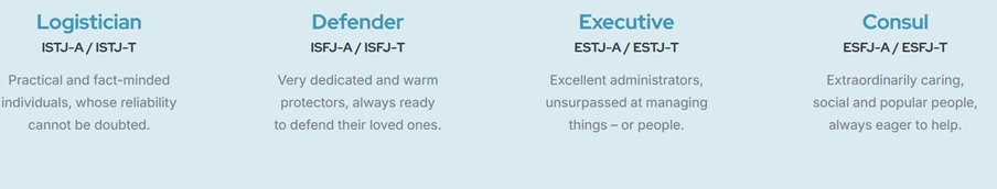 Observant (S) and Judging (J) personality types, known for their practicality and focus on order, security and stability.