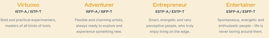 Observant (S) and Prospecting (P) personality types known for their spontaneity, ingenuity and flexibility.