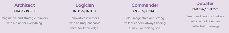 Intuitive (N) and Thinking (N) personality types, known for their rationality, impartiality, and intellectual excellence.