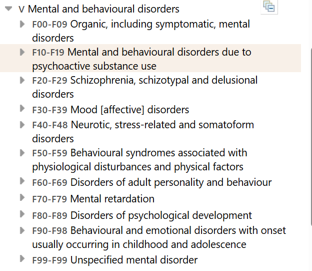 When looking through the categories and understanding what they mean, they are such as, manic episodes, bi-polar disorder, depressive episode, anxiety disorders, pretty much all mental illnesses.