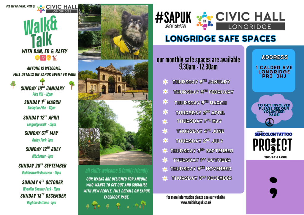 The walk & talks will have a meeting point of Longridge Civic Hall, maybe one hour / one hour and a half (distance dependant) – this will be for car sharing opportunities, (please if you could opt to drive this would be helpful, please contact me @ danielle@suicideapuk.co.uk.
